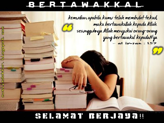 Dalam apa juga pekerjaan yang kita lakukan, utk berjaya, perlu ade usaha, doa dan tawakal. Faktor kritikal untuk keberkesanan sesuatu amalan adalah tawakal, yakni berserah diri kepada Allah. Sejak kecil, kita selalu dengar cikgu-cikgu sentiasa bagi nasihat, doa, usaha dan tawakal. Jadi, jika kita pun berdoa, berusaha bersungguh-sungguh, kemudian bertawakal.